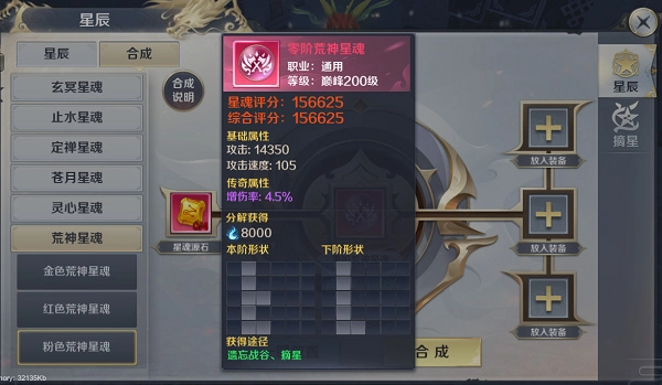 在星辰页面,当我们点开上方的合成选项便能发现,左侧陈列着各类词条的星魂,最下方则是荒神星魂。而且,从金色到红色再到粉色品质的星魂,都能够利用低阶颜色的星魂来合成。举例来说,红色星魂可通过三个金色星魂加上星魂神石进行合成,如此就能更迅速地获取自己心仪的极品星辰。