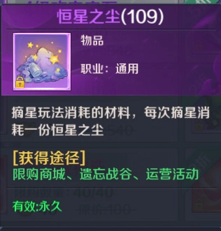 4、摘星必不可少的门票是恒星之尘,每次进行摘星操作都需消耗一个。恒星之尘获取途径有两种,一是从遗忘战谷副本中掉落,二是通过商店购买。