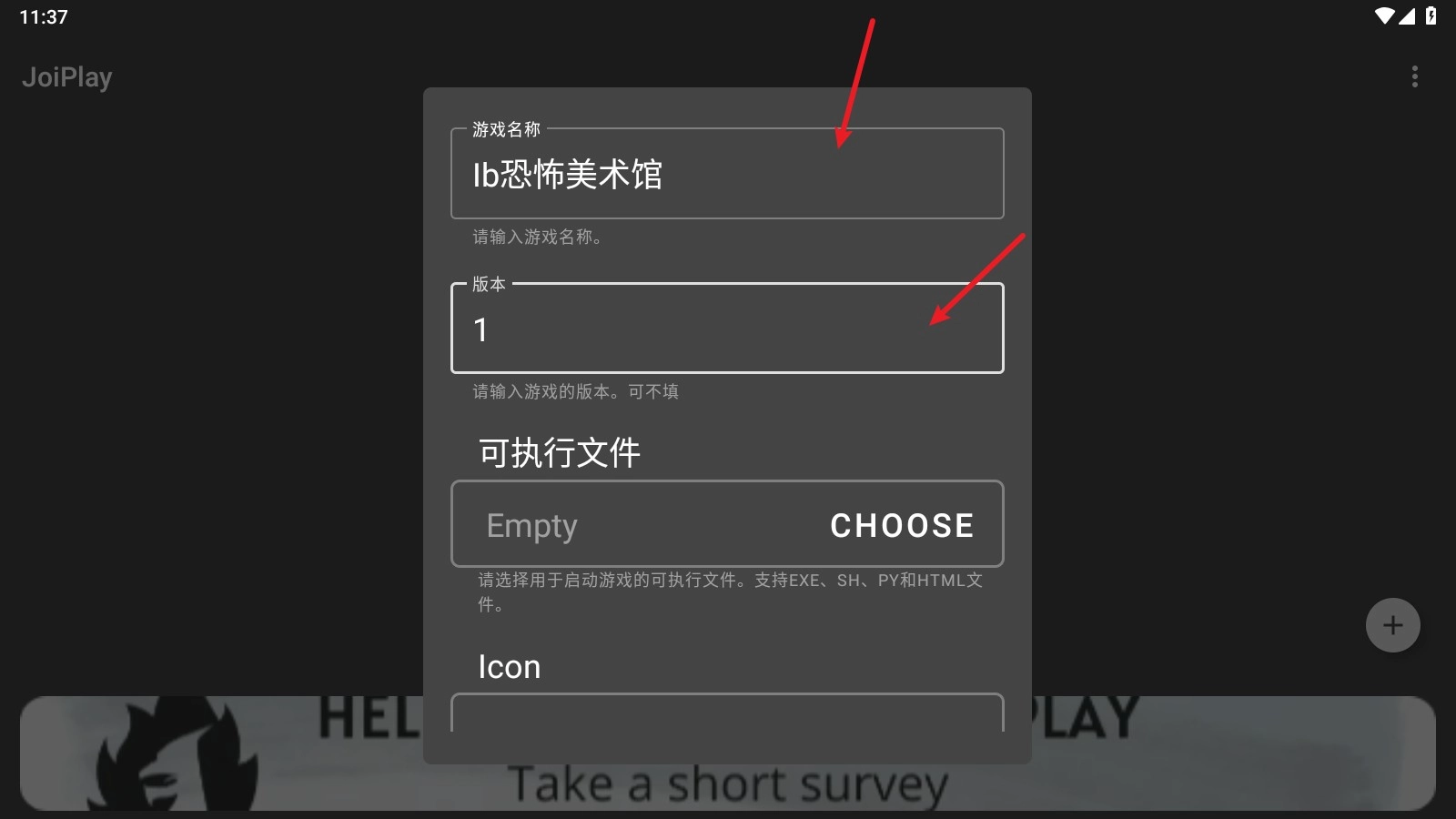2、接下来在游戏名称那一栏填写“Ib恐怖美术馆”,版本号填写1。