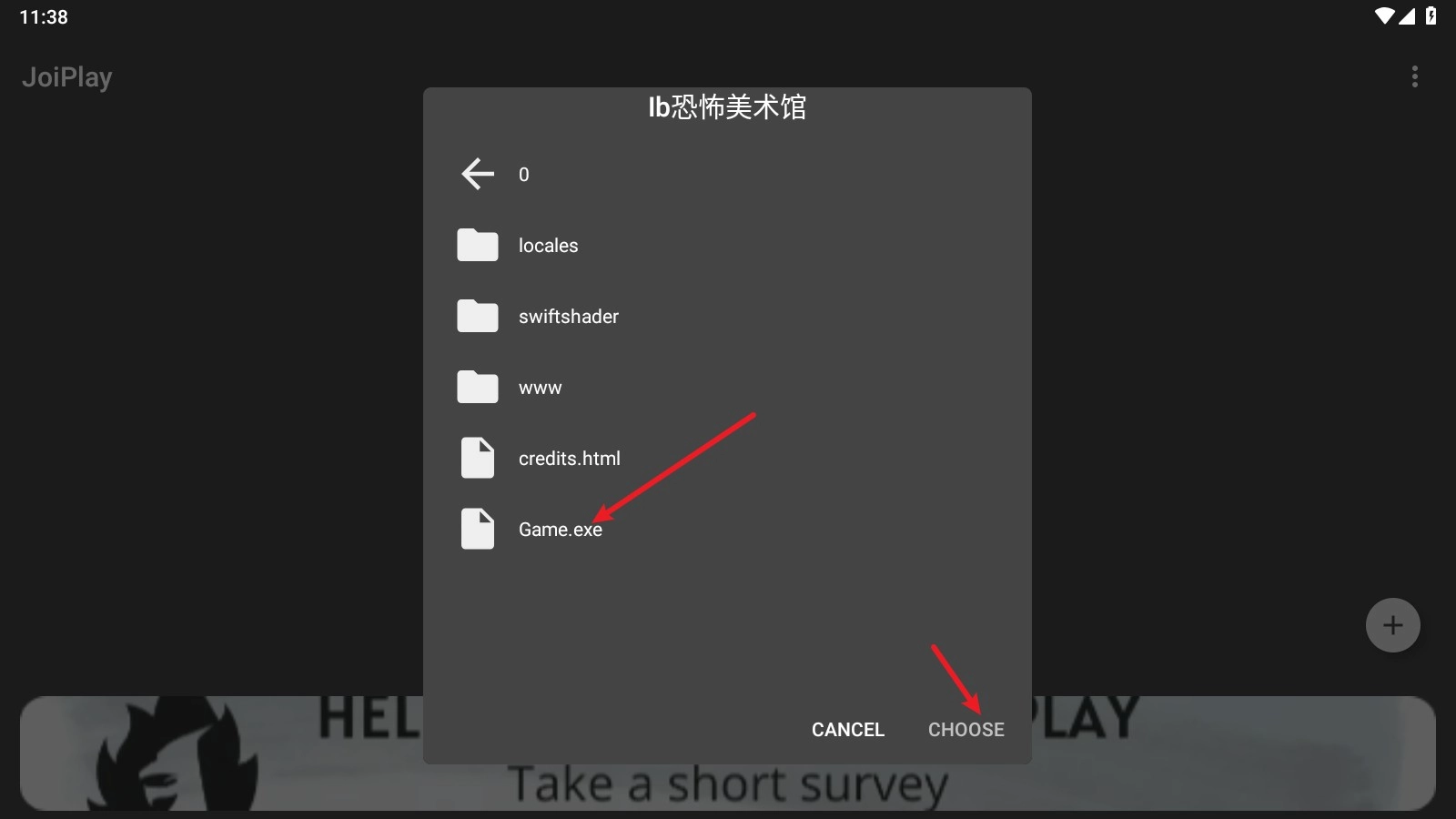 3、点击可执行文件中的“choose”,接着找到“Ib恐怖美术馆”文件夹,进入该文件夹后选择“game.exe”,随后再次点击“choose”。