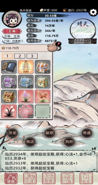 还能够接取任务以及在宗门商店购买超级、至高宝箱,开启后能获得正道高金钱加成的红橙功法,以此替换低品质功法。(需先依照攻略2接取正道任务箱子)