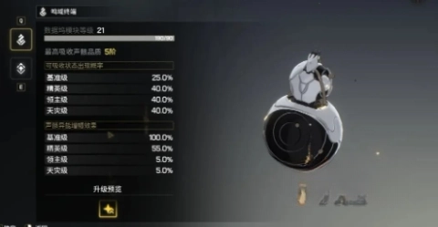 为能抓捕金色品质的声骸并显著增强其属性,建议玩家把鸣域终端等级提升到21级。声骸品质有绿、蓝、紫、金之分,强化等级最高可达5级、10级、15级、20级。