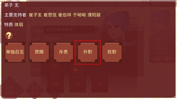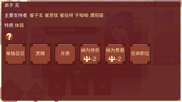 12、崔子玄与卢季庆身为世族领袖,开放科举无疑会压缩世族子弟的入仕途径,要想说服他们绝非易事。相较之下,崔子玄对你更为信任,其愿意合作的态度也展现得更为显著。倘若能与他进行某些利益互换,以提升他对你的忠诚度,那么说服他通过你的提案便存在一定可能。请点击崔子玄的头像查看他的个人资料。
