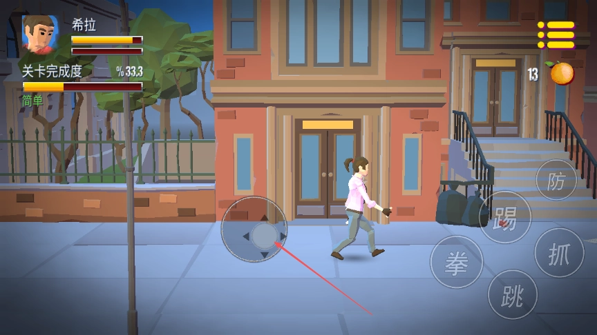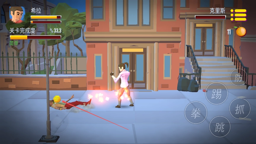 2. 点击屏幕右侧的拳按钮,向敌人发起进攻,通过累积连击数提升伤害,使敌人倒地。