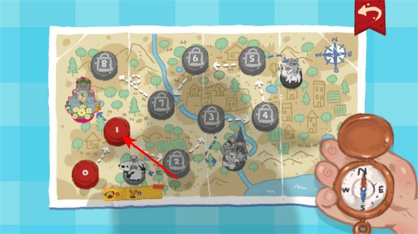1. 进行关卡选择操作,在地图上找到并点击标有红色1的关卡,随即进入与之对应的场景,进而开启关卡任务。