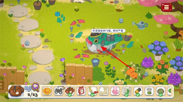 2. 对场景物品展开探索,在花园场景中留意外星飞船等物品,收集相关元素,以此推动物品收集的进度。