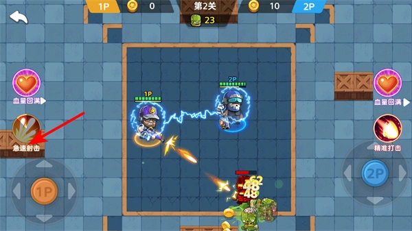 2、在战斗过程中,点击1P区域的急速射击技能按键,就能迅速向敌人展开攻击,提高输出效率。