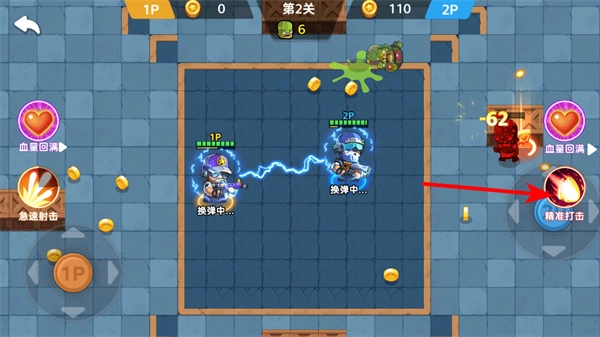 3、一旦敌人现身,点击2P区域的精准打击技能按钮,就能对敌人造成精确伤害,帮助消灭敌人。