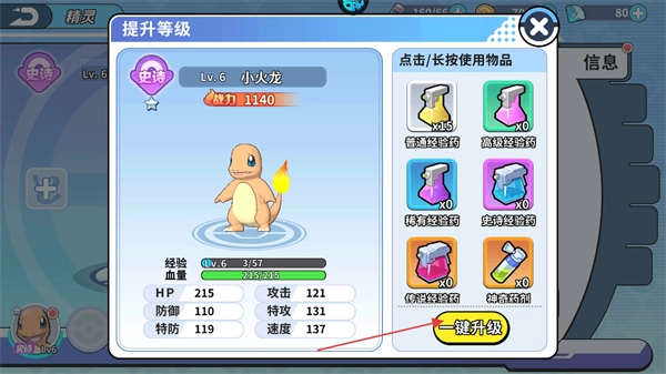 4、点击升级,使用经验药可以快速提升精灵等级。