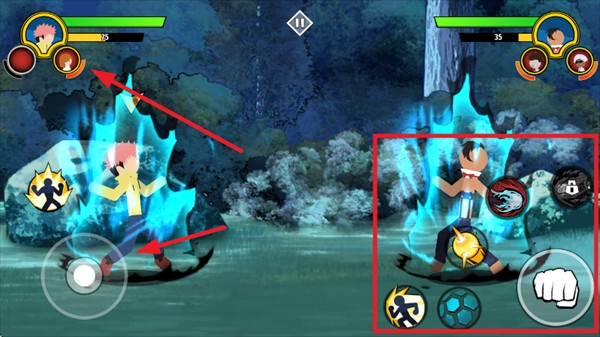 4、左侧摇杆用于角色移动,右侧设有技能攻击、防御等按键,当屏幕上方的蓝色能量条蓄满时,即可释放大招。