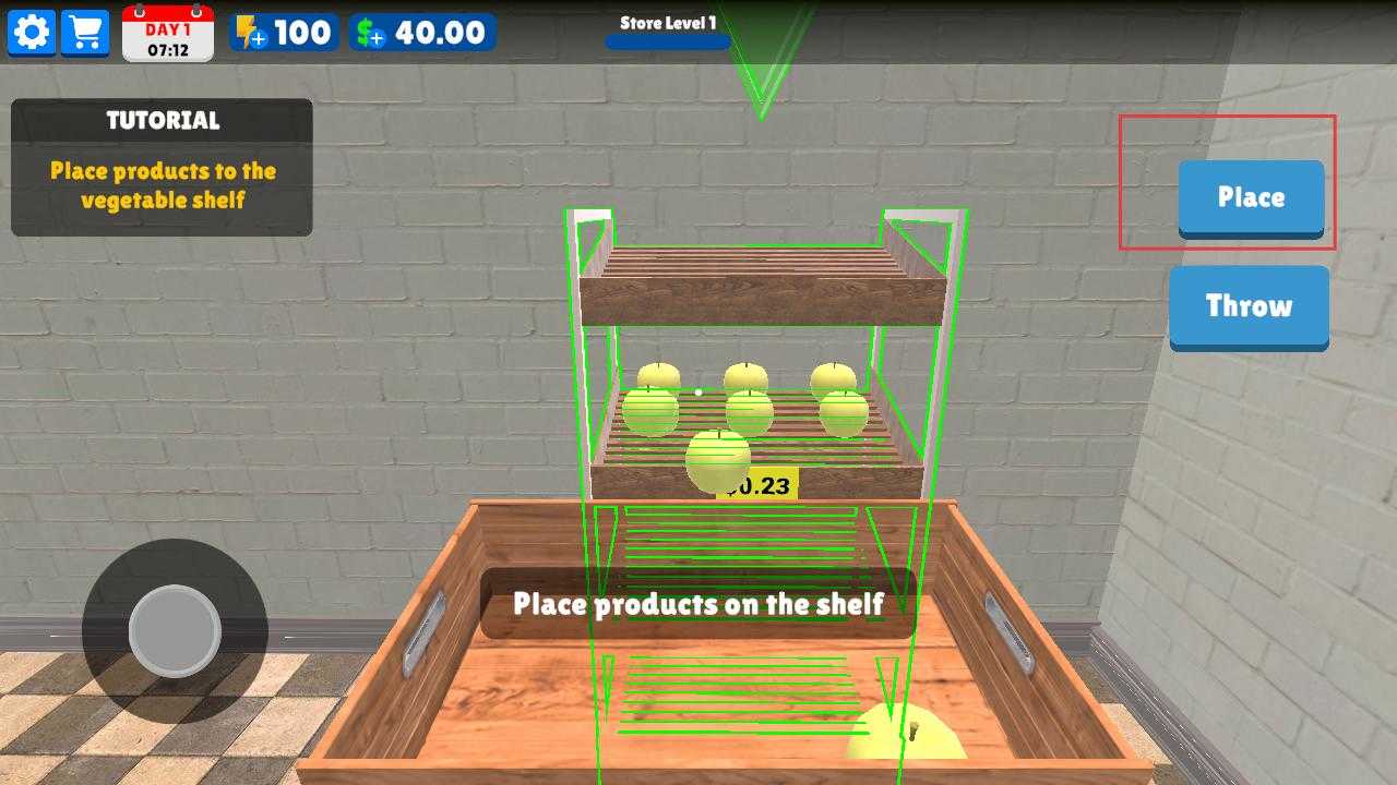 3、走进超市内部,能看到蔬菜货架。此时,对之前拿到的苹果点击“Place”按钮,就可以把苹果摆放在蔬菜货架上,从而完成陈列。