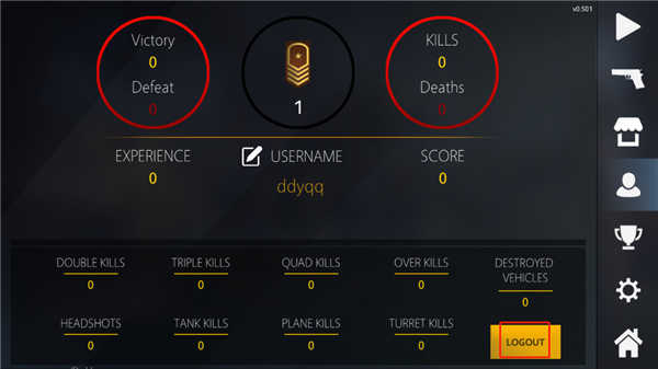 2、随后,玩家需登录个人账号方可进入战场。若尚无账号,点击头像图标,再点击【logout】。