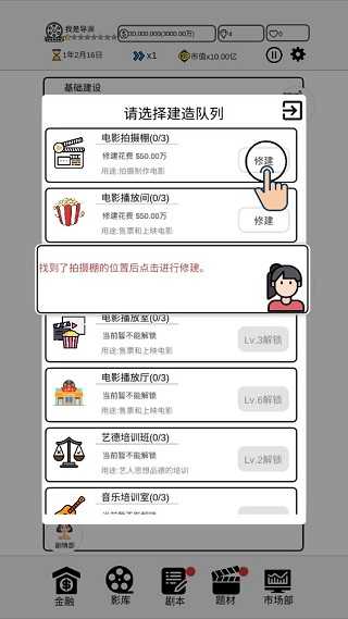 4、点击基础建设,在此处你会看到众多可供建造的建筑,像电影摄影棚、电影播放间、电影播放室、电影播放厅、艺德培训班等。在这里,我们只要找到拍摄棚的位置,点击就能开始修建。