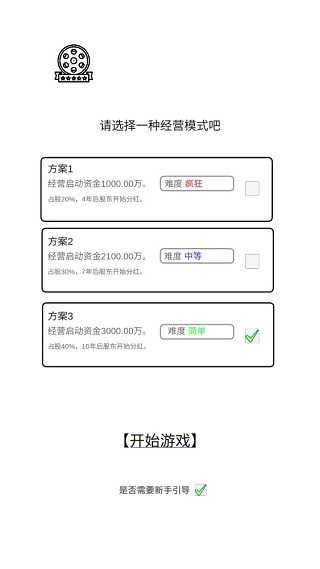 1. 踏入游戏,先挑选存档,接着选取一种经营模式,例如方案1:经营启动资金为1000.00万,占股20%,4年后股东着手分红;方案2:经营启动资金2100.00万,占股30%,7年后股东开始分红;方案3……每个选择方案所对应的难度各异。倘若你是新人导演,建议从最为简单的方案3入手。