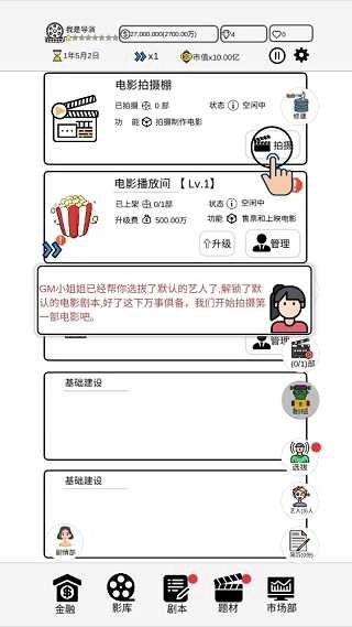 前期建设工作筹备妥当后,紧接着便是艺人选拔环节。好在初期系统已为你自动推荐了艺人,如此一来,接下来直接开启拍摄工作就行。