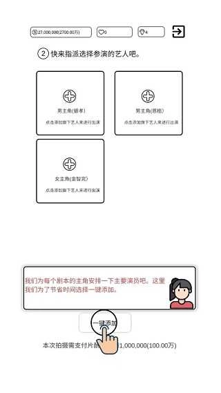 8、影片名称确定完毕后,接下来便是为剧本主角安排艺人。为提高效率,玩家能够借助“一键添加”功能完成设置。
