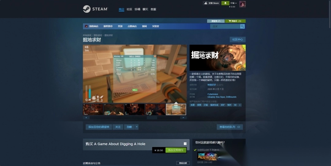 《掘地求财》目前在Steam平台推出了标准版,售价为18.5元人民币。不过该游戏暂时还没有登陆EPIC平台和PS平台,主机玩家们可能还需要再耐心等待一段时间。