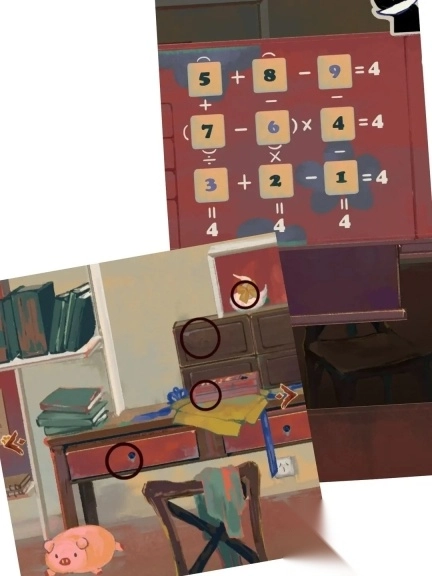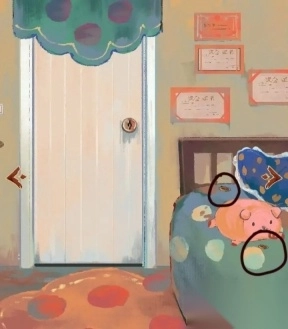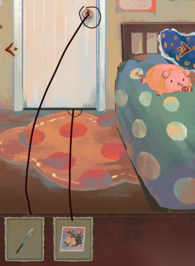回到本章初始的操作页面后,依次点击枕头与小猪造型物品的鼻部位置,可获取两枚对应等级的金属标识(推测为铜质)。