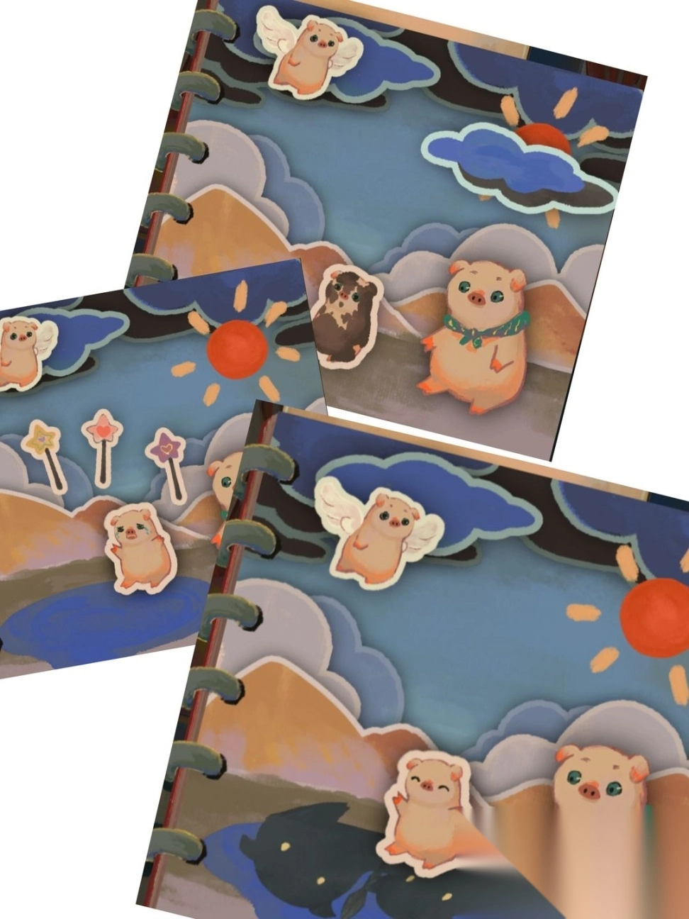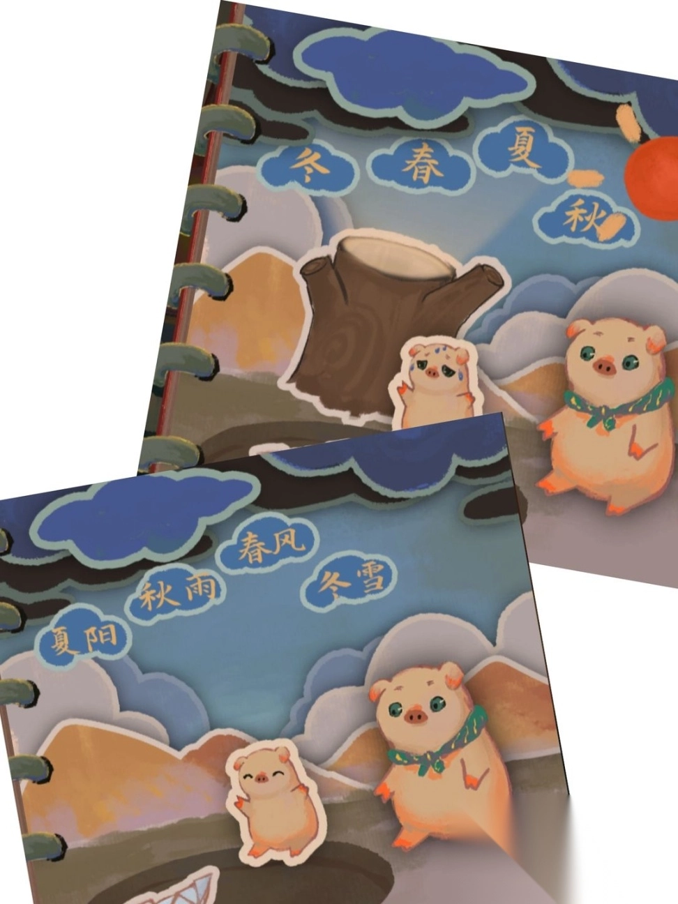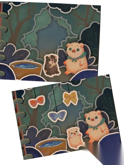 把春日的气息牵引到木桩旁,让它萌发出嫩绿的叶片,为憨态可掬的小猪撑起一片清凉的荫蔽;再将秋日的雨丝汇聚起来,在地面形成浅浅的水洼,好让那轻盈的小白船悠悠地漂荡其中。