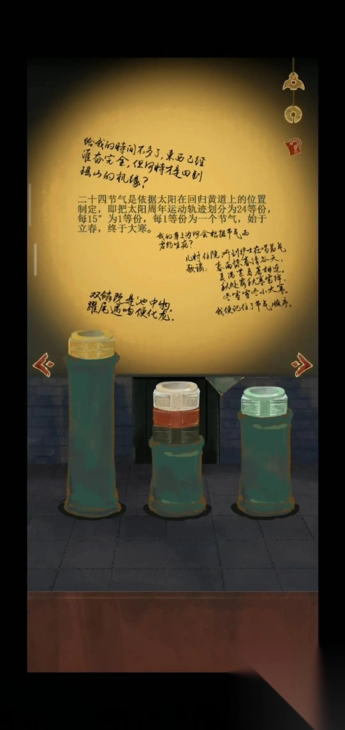 开启后,编号④⑤⑥的位置会得到一支毛笔、一件二十四节气主题的物品以及一块黑色玉琮。