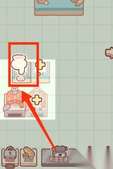在面包店界面中,通过操作两侧的箭头按钮可以切换不同场景,当进入左侧的厨房区域后,若想提升糕点制作效率,可多次点击下方的“和面加速”功能键,或者直接点击熊师傅角色,这样就能让制作过程更快推进。待糕点制作完成后,将其拖动至下方的灶台位置,即可启动烘焙程序。