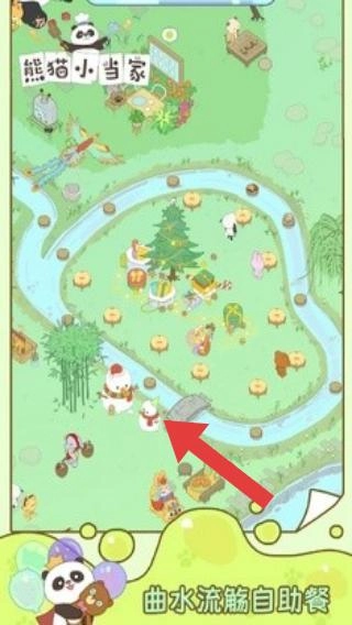3. 呈现了游戏内的场景地图,其中包含曲水流觞自助餐等元素,红色箭头指向特定位置,展现了游戏内的经营或探索场景布局。
