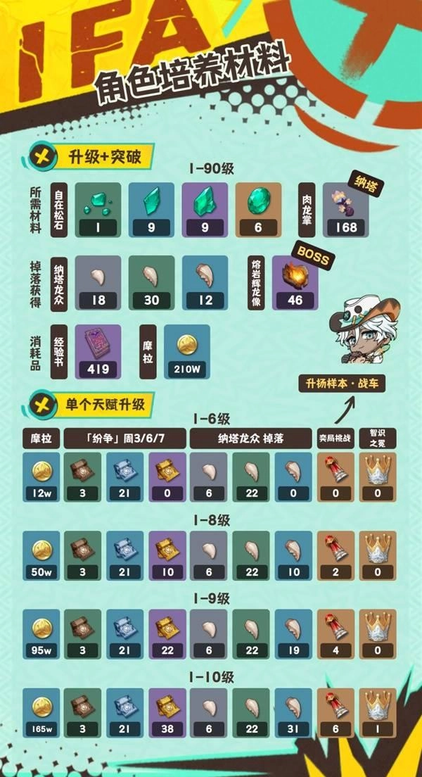 角色养成过程中,需要用到自在松石这种材料,数量分别是1枚、9枚、9枚和6枚;还得收集168只纳塔龙拳;通过挑战BOSS可以获得46个熔岩辉龙像;击败小怪能得到60个纳塔龙众,具体是18个、30个和12个的组合;此外,还要消耗419本经验书以及210万摩拉。