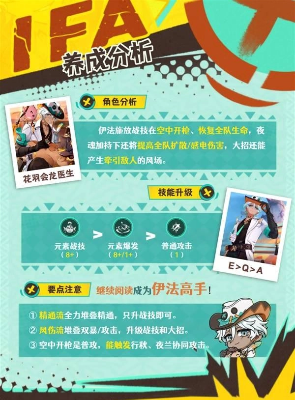 风元素角色伊法在战斗中主打扩散反应与技能输出,可作为副C或功能性辅助使用。她能通过高频且可控的元素战技,高效扩散水、雷、冰等后台元素,为主C创造连续输出的有利环境。其天赋可强化扩散感电的伤害,元素战技与元素爆发是主要输出方式。命座方面,二命能优化输出节奏,六命则可提升综合爆发能力。武器与圣遗物的选择需根据定位区分,精通向或双暴向搭配均可。