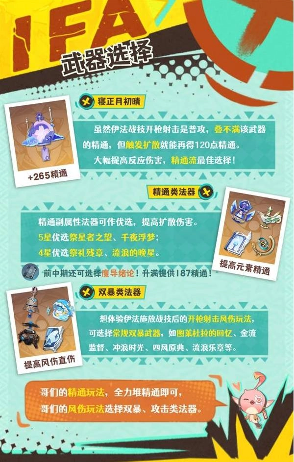 对于主打元素精通的流派,推荐优先使用能提供265点精通且在触发扩散反应时进一步增加精通的【寝正月初晴】;若没有这款武器,也可选择祭星者之望等其他精通类法器。而专注于风元素伤害的流派,则适合搭配图莱杜拉的回忆这类具备双暴属性的武器;在游戏的前中期阶段,还可以通过魔导绪论来提升元素精通属性。