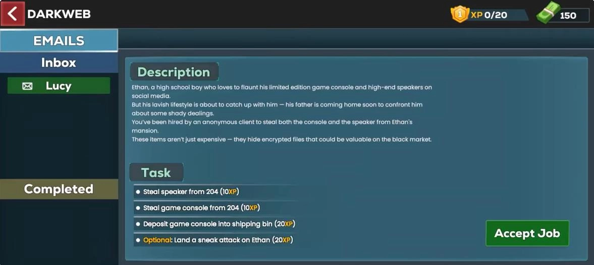 3. 允许重复挑战任务并提供多元化的选择方向,助力玩家探索不同的犯罪轨迹与最终结局。接受任务前先观察环境,规划入侵路线与逃脱方式。
