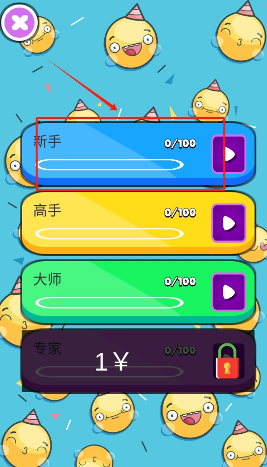 选择面向入门者的蓝色关卡图标,点击紫色的播放按钮启动游戏,这样就能开启更多富有挑战性的关卡。