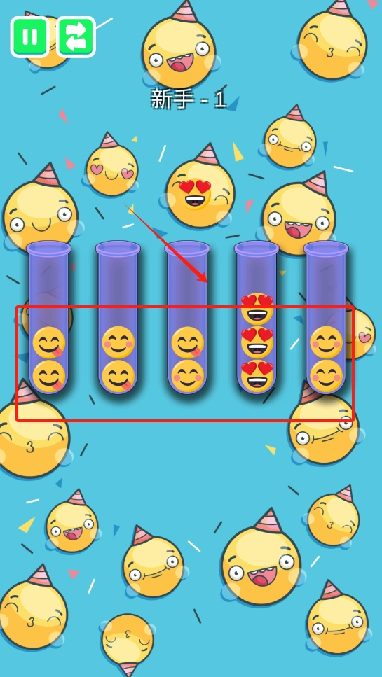 观察五个紫色试管上的表情图案,把表情一样的归为一类,这样就能通过新手关卡的第一关了。