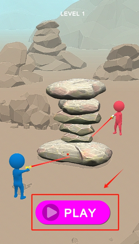 点击粉色的PLAY按钮就能开启游戏,你需要操控蓝红两个小人,用他们手中的激光剑去击打石塔。