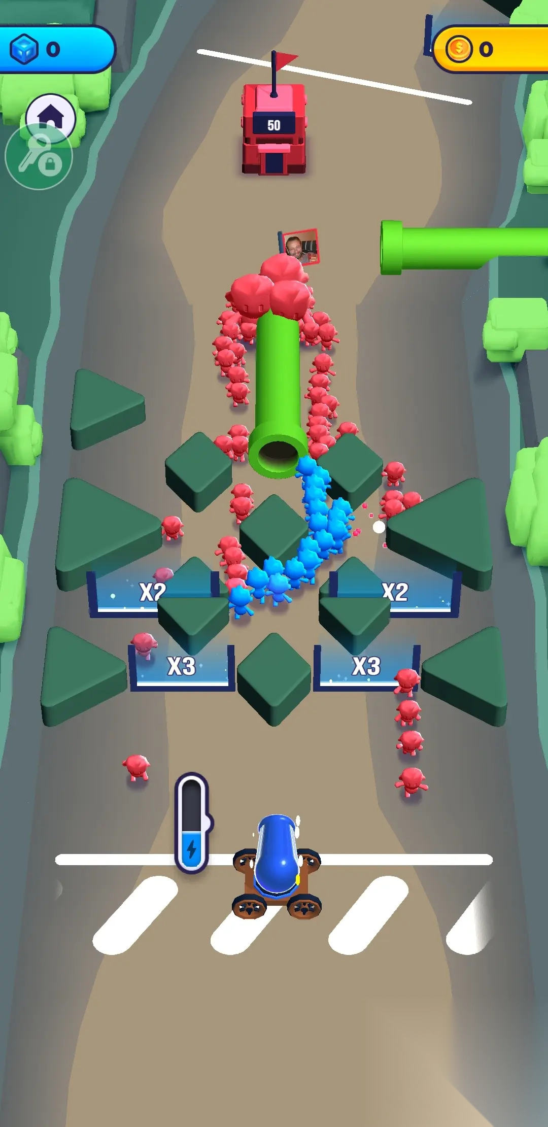 《炮弹人冲冲冲》是一款节奏明快且策略性十足的休闲益智塔防游戏,其玩法巧妙融合了即时战斗与路径规划元素,为玩家带来别具一格的游戏体验。游戏采用清新简洁的卡通画风,整体界面舒适直观,视觉呈现轻松愉悦。在每场战斗中,玩家需通过滑动操作释放炮弹人,同时依据战场局势选择恰当的增益路径,以实现队伍规模的快速扩张。随着关卡的深入,玩家还将遭遇敌人的拦截、防御设施等重重阻碍,需要精准把控每一关的节奏,在规定时间内冲破防线并占领对方据点。