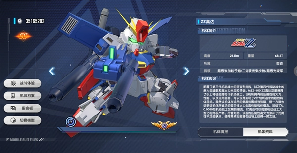 配置了第三代机动战士的可变形结构、新人类适配系统与高出力米加粒子炮,MSZ-010 ZZ高达正是集这些特征于一身的跨时代机动战士。它在火力、性能及运用层面展现出的压倒性优势,堪称Z计划所追求的极致机体目标的完美实现。尽管该机体的武器运用范围相对局限,但这恰恰体现了其对毁灭性火力的高性能机体概念的执着追求,整体设计也延续了U.C.0080年后机动战士的发展潮流。不过,其压倒性的高火力足以弥补泛用性上的不足,让它在战场上依然能占据重要地位。