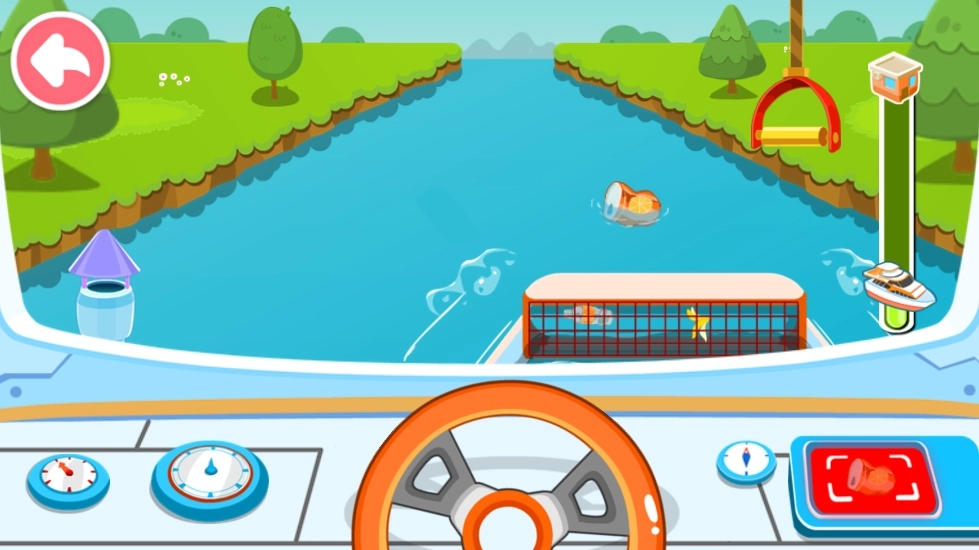 不妨去河道清洁体验区瞧一瞧!这里的水面上漂着香蕉皮、纸团、汽水瓶之类的各种垃圾,要怎么给河流来一次彻底的“大扫除”呢?只要驾驶清洁船,就能借助网兜把垃圾打捞上来:先启动清洁船,接着向左转动方向盘,让网兜靠近漂过来的垃圾,然后把它捞出水;哎呀,右边又漂来碎瓦片了,赶紧把方向盘向右转,把这些垃圾也捞进网兜里吧。