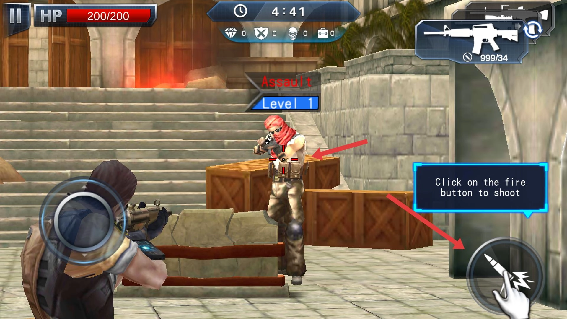 战斗时滑动虚拟摇杆,转动视角对准敌人,借助掩体,变换位置,锁定目标,准备开火。
