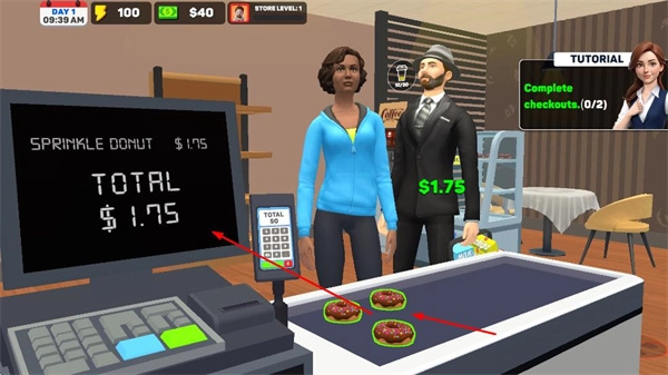 顾客走到收银台前,把商品放在收银台上,收银机随即显示出商品的名称和总金额,比如甜甜圈的总价是1.75美元,这样就完成了结算前的准备工作。