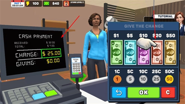 在收款的时候,依据实际收到的现金数额来算出需要找零的钱数,接着在找零的操作界面里挑选相应面值的钱币,把找零这件事做完。