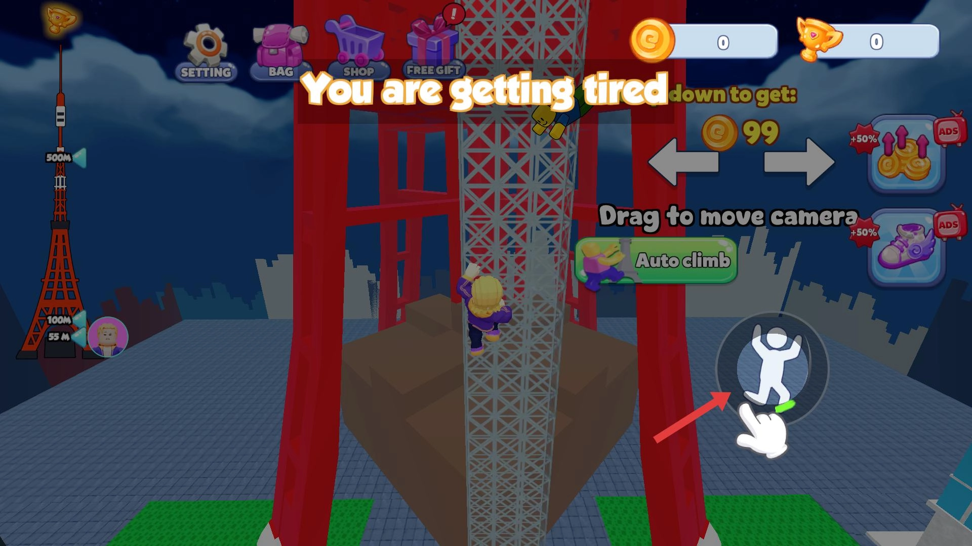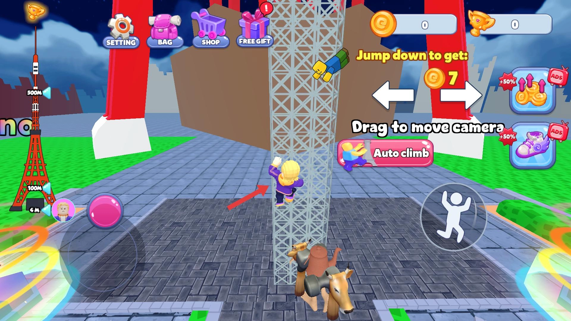来到高塔附近,点击攀爬按钮,既可以手动操作,也能选择Auto climb模式。注意留意上方的金币奖励,攀爬过程中要避开掉落的物体,持续向上前进。