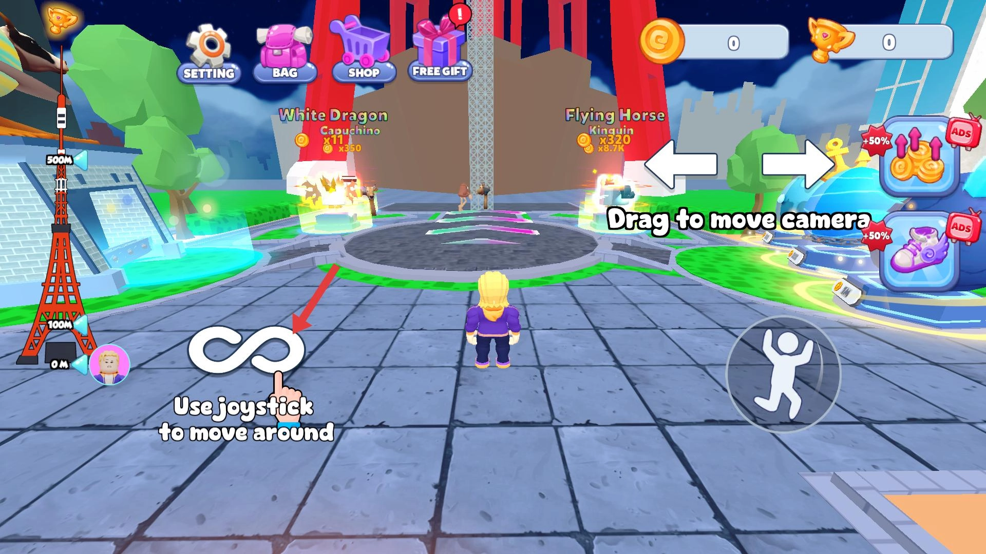 通过摇杆操控角色移动,滑动屏幕来调整镜头视角,先熟悉一下场景布局。你可以去商店逛逛领取免费礼物,还能参与White Dragon等区域的活动。