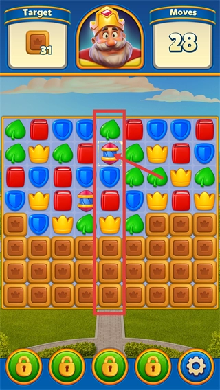 合成【竖列特效道具】后,使用该道具能够消除整列元素,从而快速减少下方皇冠方块所面临的遮挡障碍。