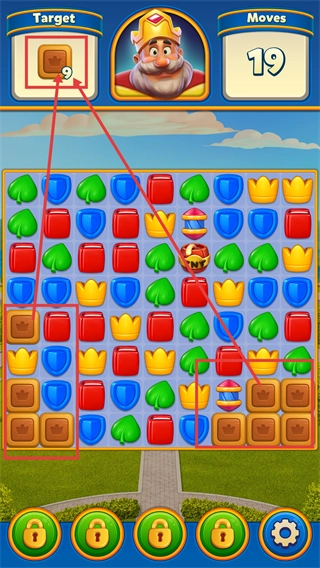 当【皇冠方块】还剩【9】个时,把注意力集中在它们所在的区域进行消除操作,借助特效道具来加快收集进度。