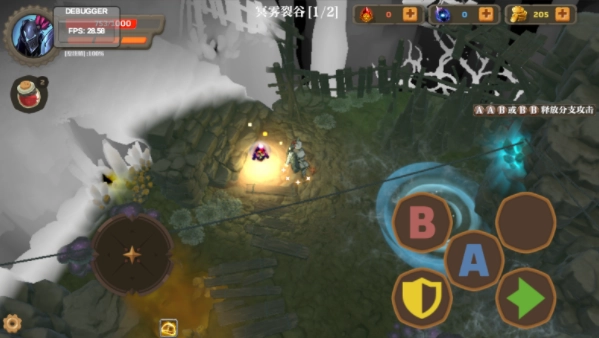 进入游戏后,左侧区域用于操控角色移动,右侧的A、B键对应两种不同的攻击手段,护盾功能可实现格挡,绿色箭头则代表闪避动作。