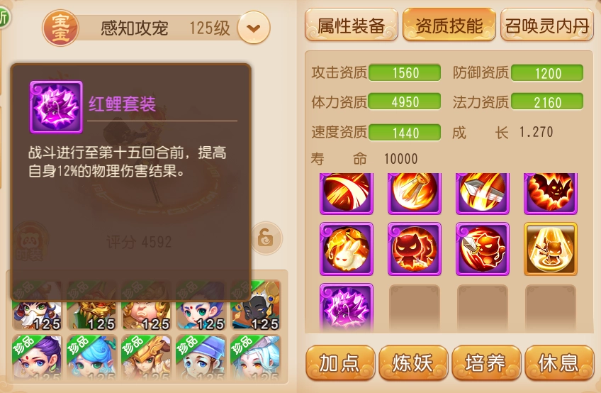 更何况在近期的战斗平衡调整里,红鲤的套装效果也得到了加强,物理伤害结果提升的回合数有了明显改变,再配上强势的降防内丹“秋枫破”和“高级突进”技能,红鲤在全民攻宠中绝对算得上数一数二的暴力存在。