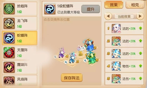 不过由于三大防御型阵法(物抗地阵、法抗蛇阵、封抗雷阵)里的蛇阵进行了调整,双法队伍不得不舍弃这个防御型阵法,转而选用进攻性更突出但抗性相对薄弱的风阵与虎阵,这使得法系队伍在当前的PVE战斗中带上了几分“激情对冲”的色彩——要么击败对手,要么被对手击败。