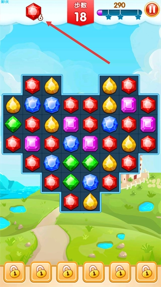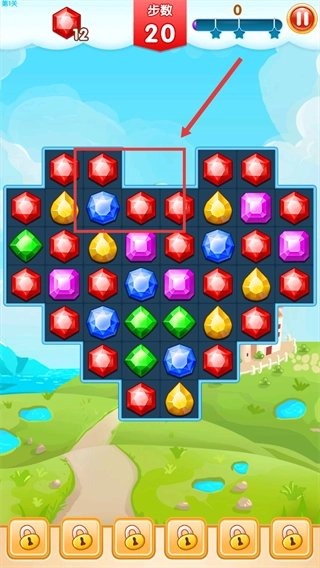 拖动相邻同色宝石(如红色宝石)完成消除。