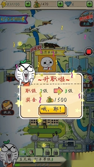 点击升级按钮后,会解锁一个新技能,其余技能将在后续逐步获取,只需持续通关即可。接着我们进入新关卡“没收手机”:小明上课玩手机被老师收缴,不料那是三星Note7,手机爆炸把老师炸成了爆炸头。之后老师发布任务,我们通过抢单挑战小明,目的是让他上课不再玩手机。