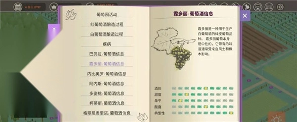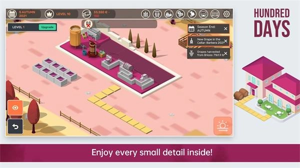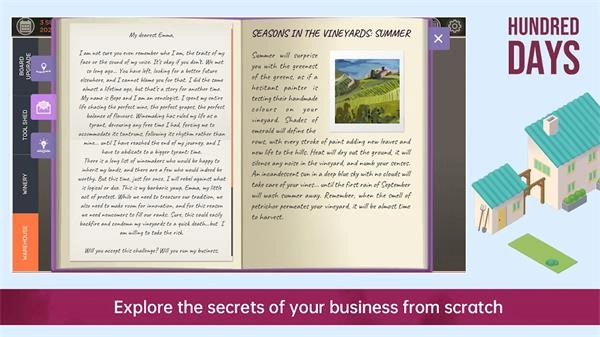 《酿造物语》(英文名为Hundred Days)是一款酒庄模拟经营游戏。在游戏里,你将化身为酒庄的主人,负责管理酒庄运营的各个环节,包括葡萄种植、酿造工艺以及市场销售等。游戏完整还原了从葡萄剪枝、压皮、发酵,到橡木桶熟成、装瓶的全过程,你需要对温度、湿度、酵母种类等参数进行调控。