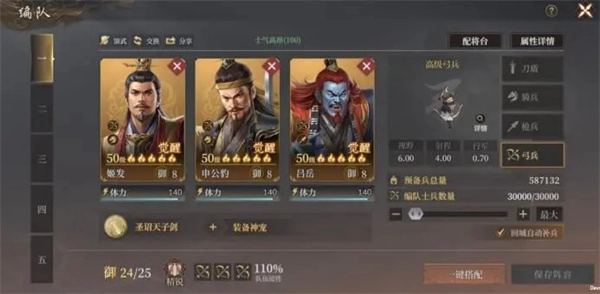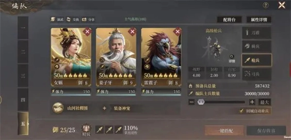 兵种之间存在克制关系:弓兵克制枪兵,枪兵克制骑兵,骑兵则克制弓兵;盾兵防御能力出色,器械擅长攻城,二者独立于上述循环克制体系之外。此外,若上阵三名同兵种武将,还能激活全队属性加成效果。